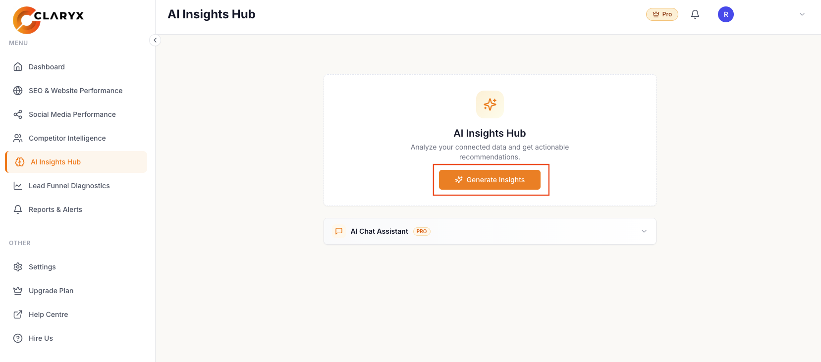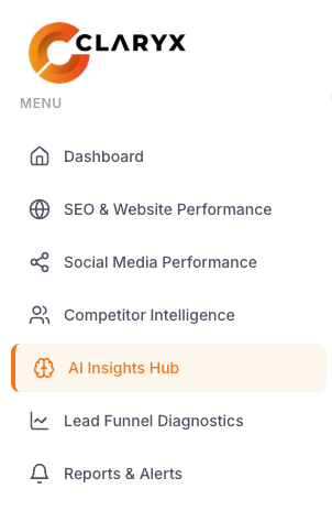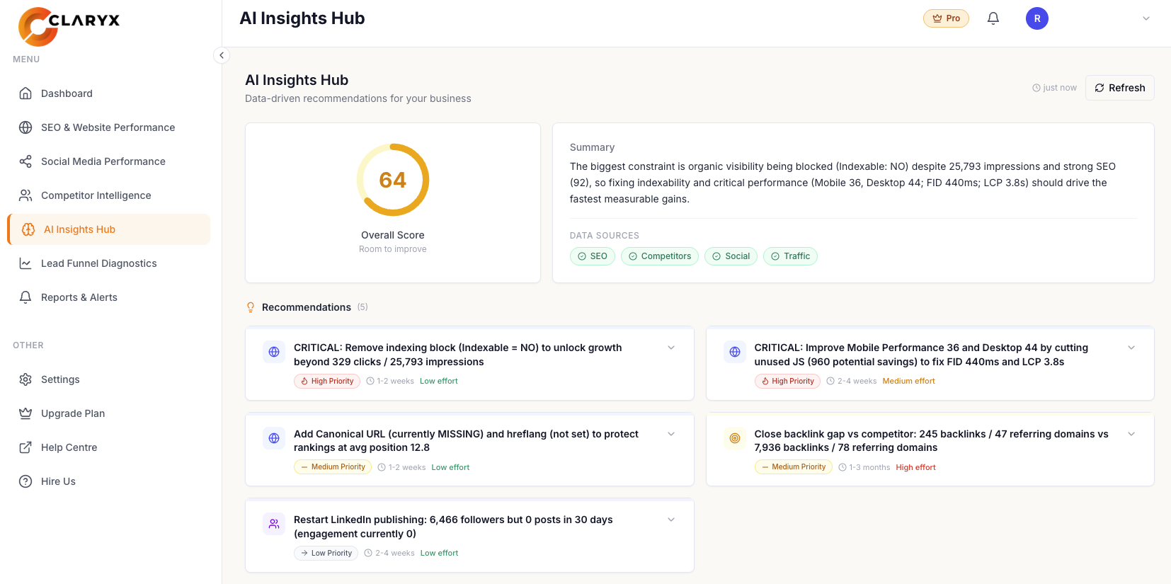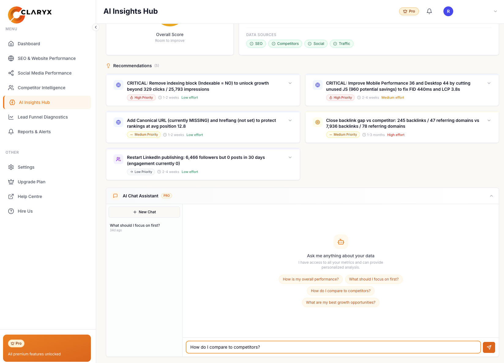 Instead of looking at SEO, social, and competitor data separately, Claryx analyzes all your data and tells you:
