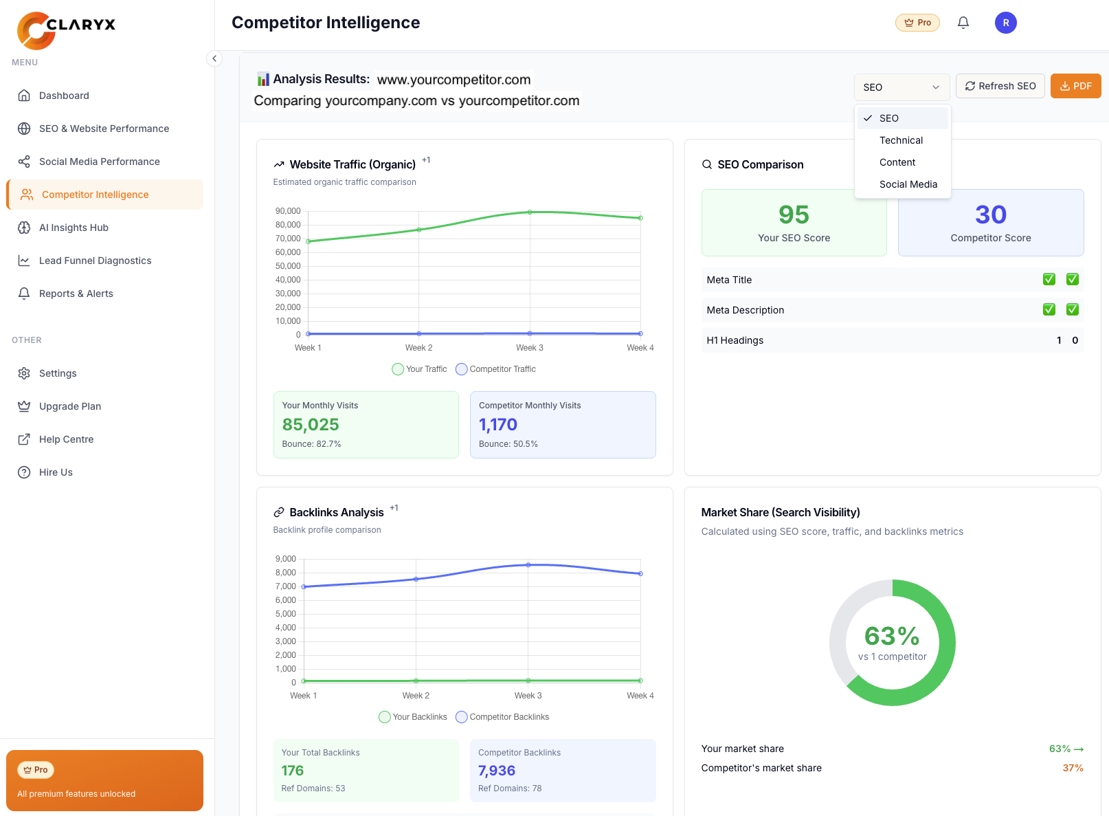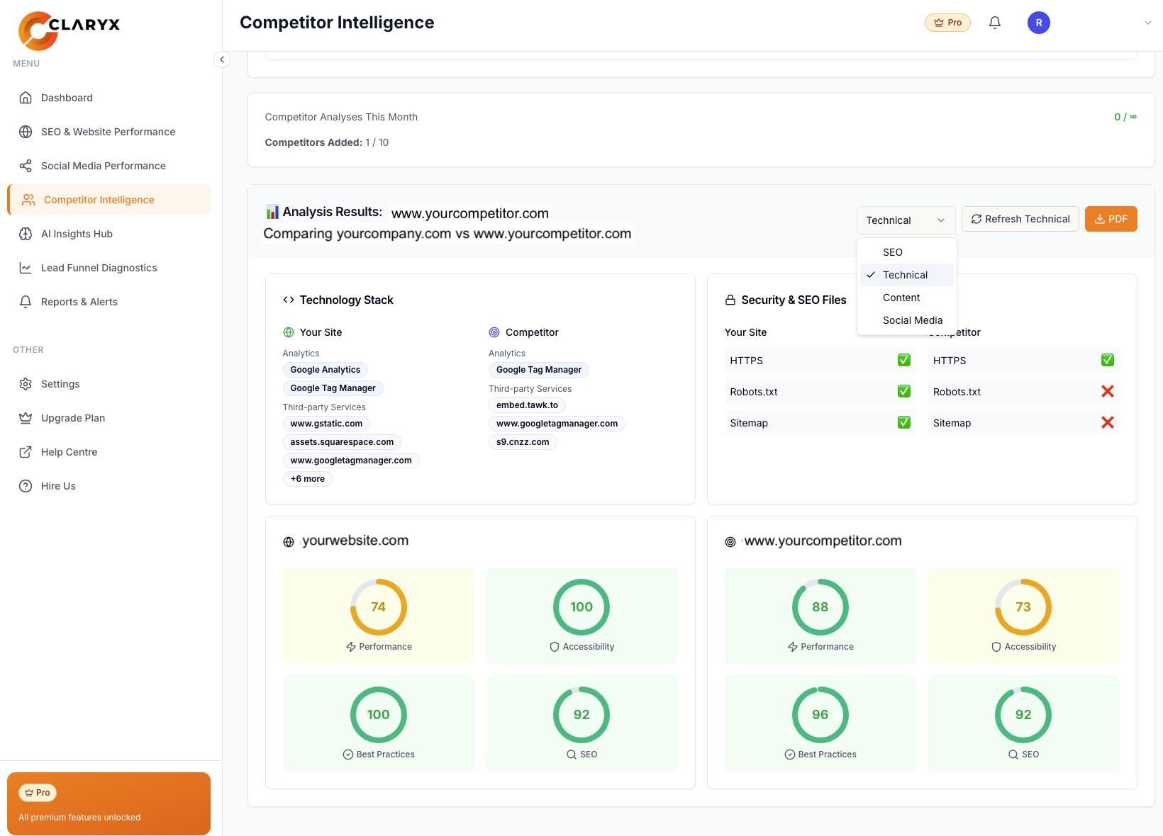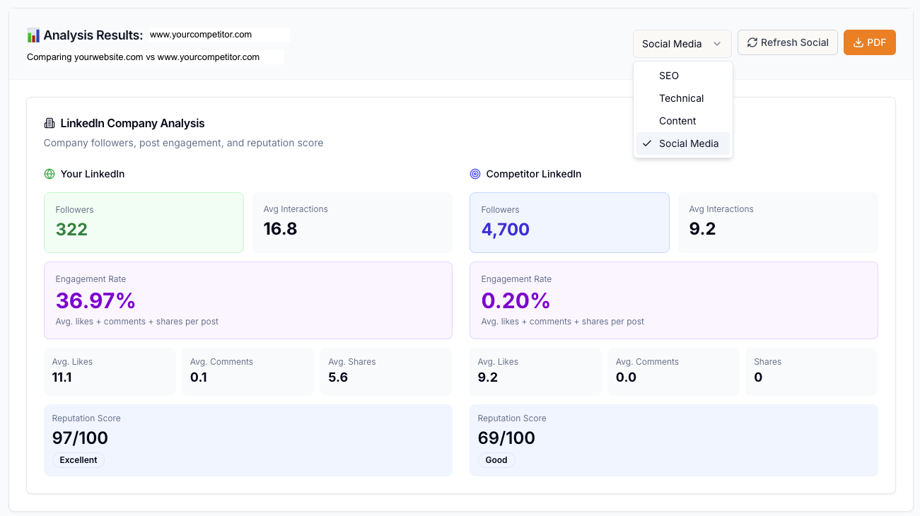 - Compare your SEO, content, and social performance